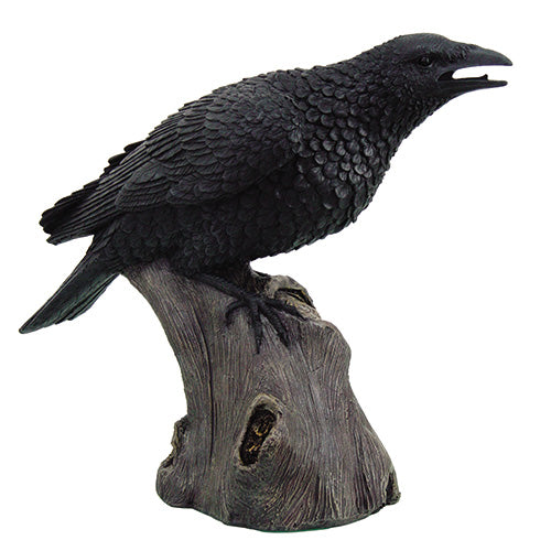 This large raven sculpture, crafted from cold cast resin, measures 14.25" x 6.25" x 12.5". Featuring a raven perched on a stump, it showcases detai...