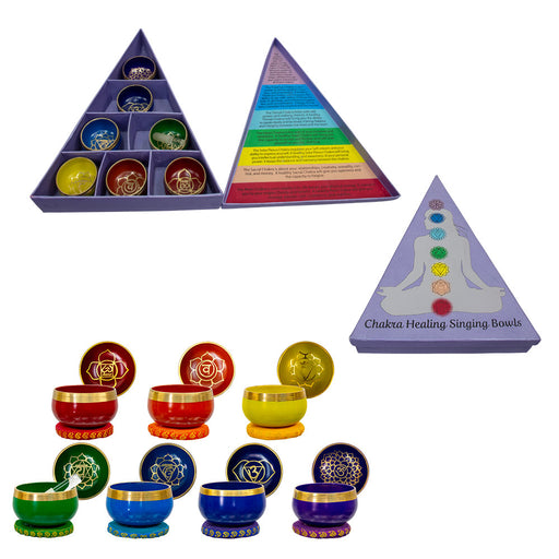 A set of 7 Chakra Singing Bowls. Each bowl comes with it's own cushion. One stick per box.