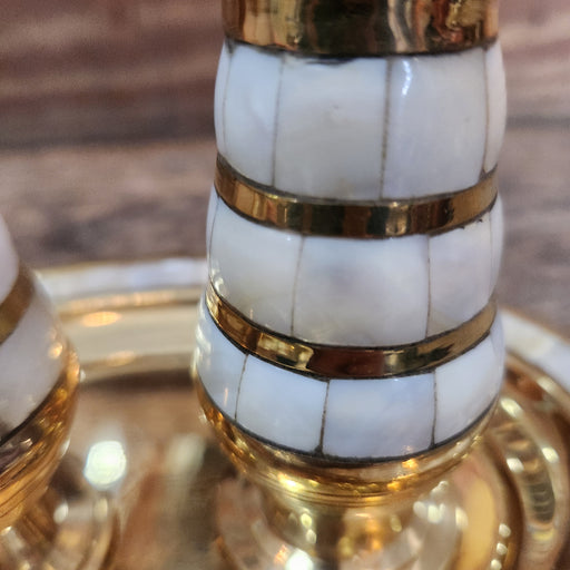 This vintage salt and pepper tray is a handcrafted piece from India, made of solid brass with exquisite shell inlay. The tray features intricat...