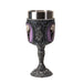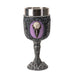 The Raven Skull Goblet is expertly crafted from cold cast resin and metal, measuring 3" x 3" x 7.25". This collectible goblet combines striking design with durable construction and is food safe, making it suitable for both display and practical use in themed settings.