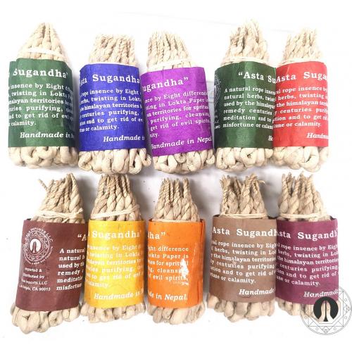 A natural rope incense by eight different natural herbs (Saldhoop, Camphor, Valarian, Jatamasi, & Sugundha Kokilla) twisting in Lokta paper, used by the Himalayan territories for spiritual remedy, purifying , cleansing, meditation, and to get rid of evil spirits, misfortunes or calamity